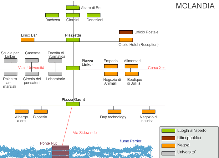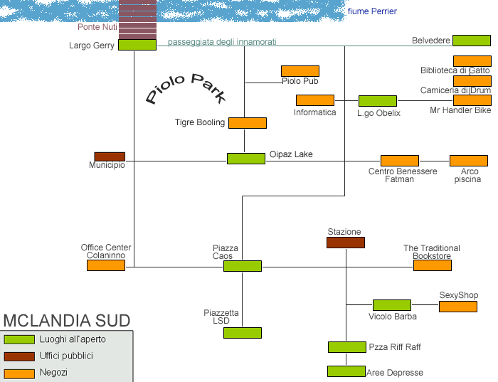 La citta' e' divisa in due zone, la zona nord e la zona sud dal fiume Perrier. L'unico modo per spostarsi da nord a sud (e viceversa) e' Via Sidewinder Qui sotto potrete trovare le mappe della citta'.